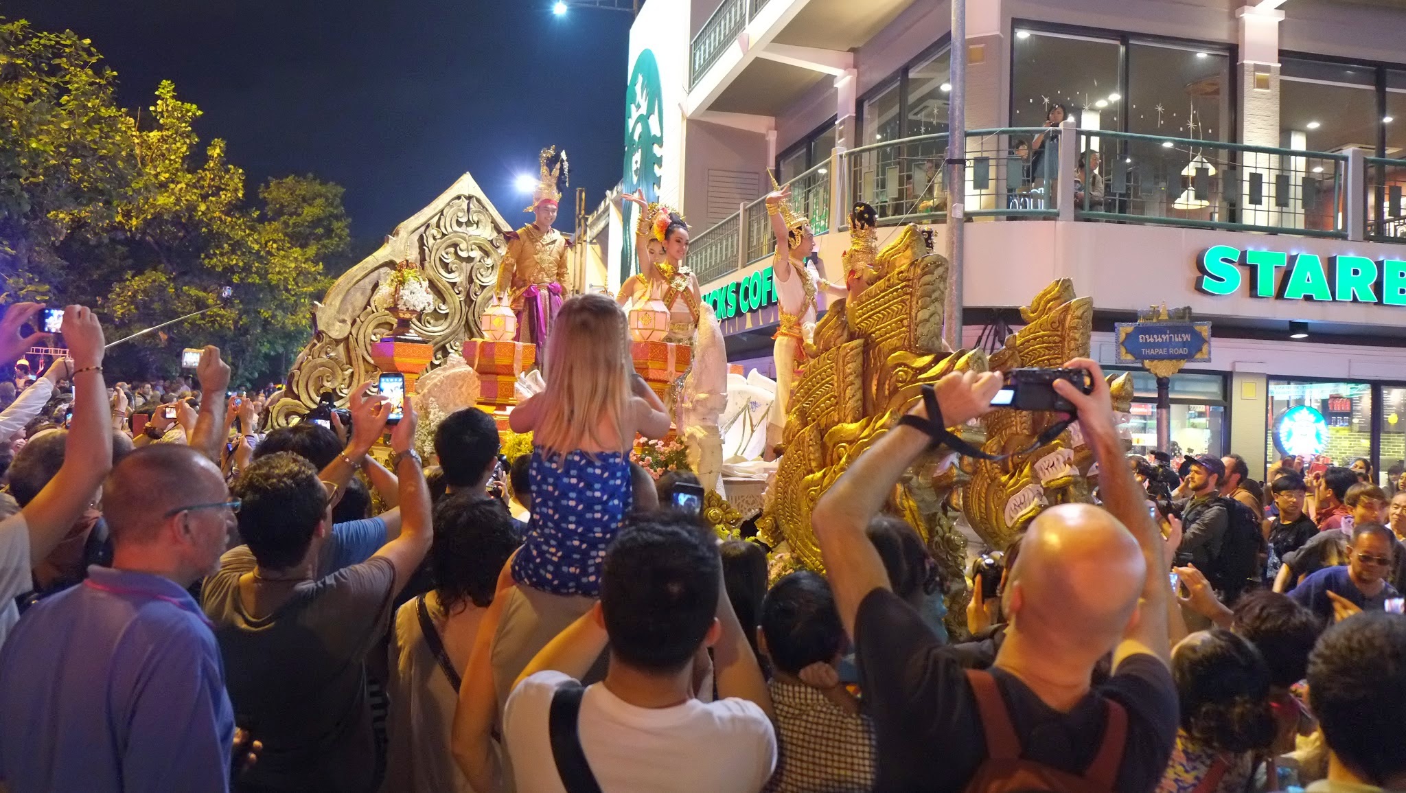 水灯节花车游行在夜晚7点举行,夜色降临后可以看见天上很多天灯,天灯水灯将整个古城都照亮了。虽然没有万人天灯那么密集,但那零星点点,也是一道灿烂的风景,当晚还有清迈小姐选美,就在塔佩门的城门举行。
